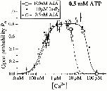 Figure 5. [Ca2+]i dependence of the Po of the X-InsP3R-1 channel activated by saturating concentrations of ligands in the presence or absence of ATP. (A) 10 μM InsP3; (B) 100 nM AdA. The solid and dashed curves are theoretical fits by the Hill equation () of the data in 0 or 0.5 mM of ATP, respectively.