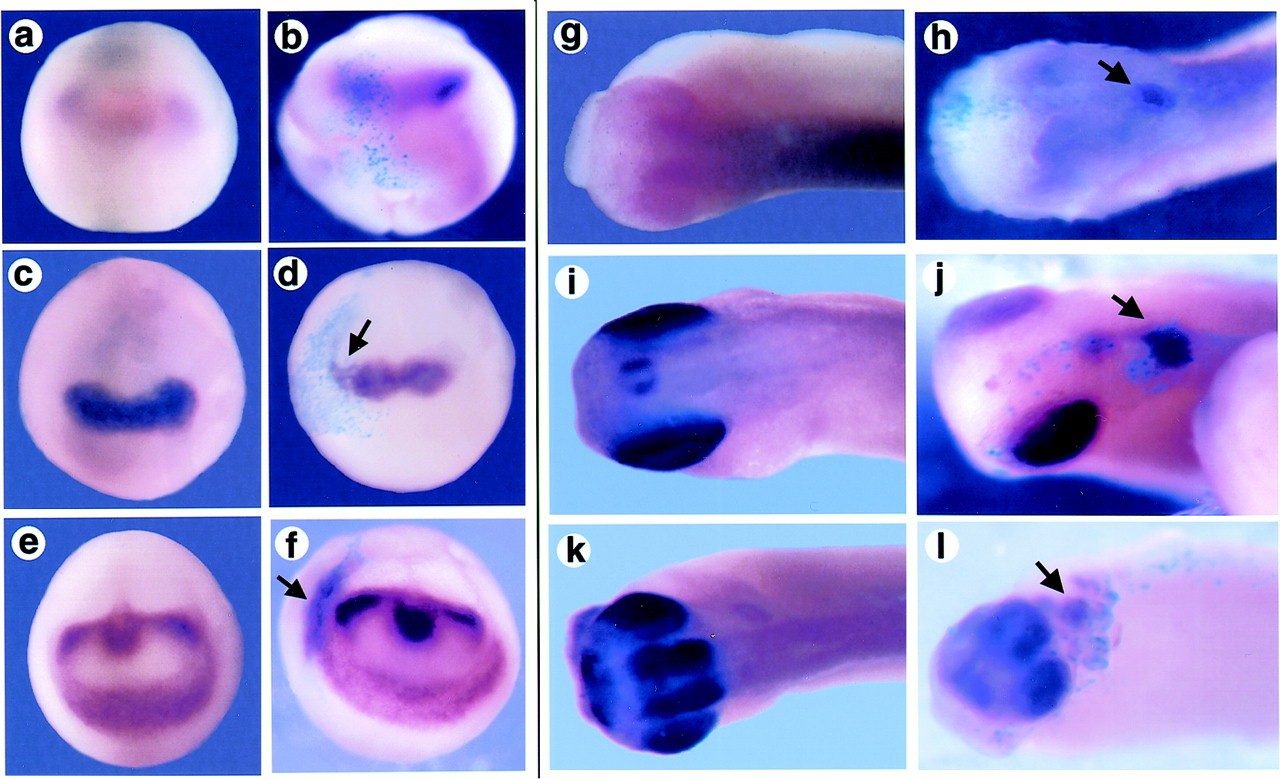 Overexpression of Xfz3 promotes ectopic expression of genes regulating eye development. A whole-mount in situ hybridization analysis was made of stage 14 embryos (a) that were either uninjected (a, c, and e) or Xfz3 injected (b, d, and f) and then labeled for Xpax6 (a and b), Xrx (c and d), or Xotx2 expression (e and f). Arrows indicate modest expansion of Xrx or Xotx2 expression (d and f). Stage 28 embryos (g) are either uninjected (g, i, and k) or Xfz3 injected (h, j, and l) and then labeled for Xpax6 (g and h), Xrx (i and j), or Xotx2 expression (k and l). Arrows indicate ectopic expression in injected embryos (h, j, and l). β-Galactosidase (sky blue) marks the regions of the embryo derived from the injected blastomere.