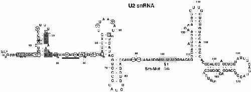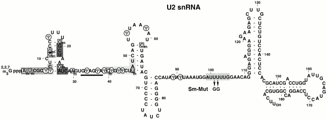 Figure 1. Primary and secondary structure of Xenopus U2 snRNA. Internal modified nucleotides are highlighted by circles (pseudouridines) and squares (2â²-O-methylated residues). The Sm binding site is indicated by a hatched gray box. Sequences known or predicted to be involved in intermolecular interactions are indicated: the thick line denotes bases interacting with the branch site of pre-mRNA; sequences boxed in dark gray, medium gray, and light gray are involved in U2-U6 interactions called Helix I, Helix II, and Helix III, respectively (Nilsen 1998). The arrows indicate mutations introduced into the Sm binding site (Sm-Mut).