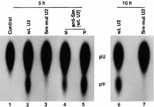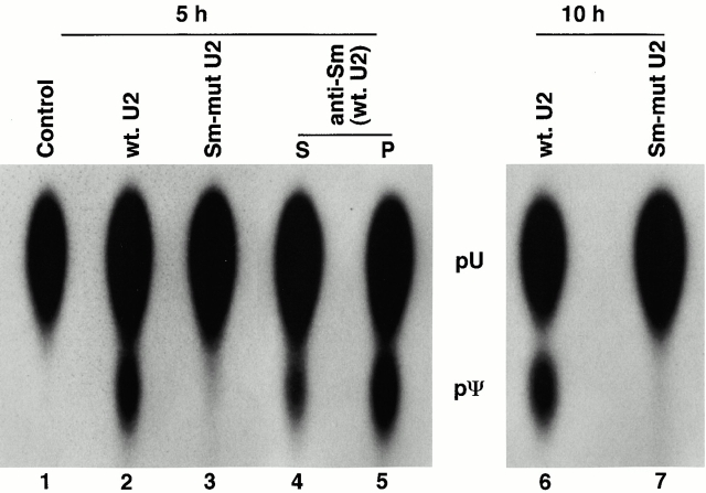 Figure 3. Binding of Sm proteins is required for U2 internal modification. [α32P]UTP uniformly labeled wild-type (lanes 2, 4, 5, and 6) or Sm-mutant U2 (lanes 3 and 7; see Fig. 1) was injected into isolated nuclei under oil. After 5 h (lanes 1â5) or 10 h (lanes 6 and 7) at room temperature, RNAs were recovered by phenol-chloroform-isoamylalcohol extraction and ethanol precipitation and subjected to the pseudouridylation assay (lanes 1â3, 6, and 7). For the wild-type U2, â¼40% (lane 2, 5 h) or 50% (lane 6, 10 h) of the expected level of modification was observed. Alternatively, wild-type U2 was recovered by anti-Sm (Y-12 antibody) immunoprecipitation after 5 h at room temperature and then subjected to the pseudouridylation assay (lanes 4 and 5). More than 85% of the expected level of modification was observed in immunoprecipitated RNA (lane 5). S, supernatant; P, pellet. The control is an uninjected U2 RNA.