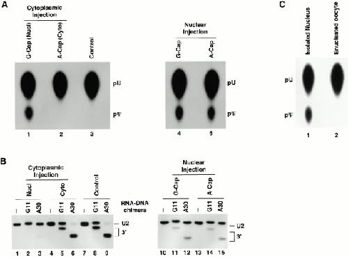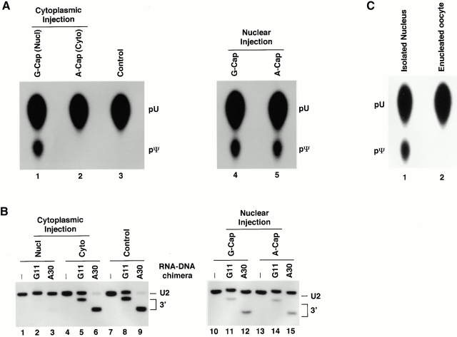 Figure 2. U2 internal modifications occur exclusively in the nucleus. α[32P]UTP uniformly labeled G- or A-capped U2 was injected into the cytoplasm of oocytes (A, lanes 1 and 2; B, lanes 1–6) or directly into nuclei (A, lanes 4 and 5; B, lanes 10–15). After cytoplasmic injection, only G-capped U2 entered the nucleus; after nuclear injection, both G- and A-capped U2 RNAs were retained in the nucleus. RNAs recovered from nuclei (A, lanes 1, 4, and 5; B, lanes 1–3, 10–15) or from cytoplasm (A, lane 2; B, lanes 4–6) were assayed for pseudouridylation (A) and 2′-O-methylation (B). In the 2′-O-methylation assay, two different chimeras were used to test two positions (G11 and A30). The control is uninjected U2 RNA. (C) Oocyte nuclei were separated from the cytoplasm under oil. α[32P]UTP uniformly labeled U2 was then injected into the isolated nuclei (lane 1) or enucleated oocytes (lane 2). After a 5-h incubation, U2 RNAs were recovered and assayed for pseudouridylation. The positions of uridylate, pseudouridylate, uncleaved U2, and 3′ fragments generated by RNase H site-specific cleavage are indicated on the side of each gel. In these experiments, >80% of the expected level of pseudouridylation and 2′-O-methylation was observed.