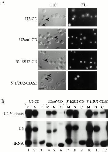 Figure 6. (A) Intranuclear localization of U2-C/D motif chimeras. 1 fmol of fluorescein-labeled wild-type U2-C/D motif chimera (U2+CD), Sm-mutant U2-C/D motif chimera (U2smâ-CD), 5â² 1/2U2-C/D motif chimera (5â² 1/2U2-CD), or 5â² 1/2U2-C/DÎC motif chimera (5â² 1/2U2+CDÎC) was injected into Xenopus oocyte nuclei, and nuclear spreads were prepared 5 h later. DIC and fluorescence (FL) panels are shown for each field. The arrowheads in the DIC panels indicate Cajal bodies. (B) Nucleocytoplasmic distribution of the U2-C/D motif chimeras. The distribution of the injected RNAs within the nuclear and cytoplasmic oocyte compartments was determined as described in the legend to Fig. 4 B. Bar, 10 μm.