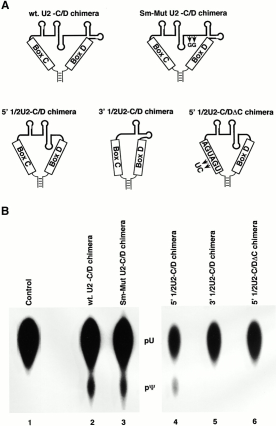 Figure 5. Introduction of a snoRNA nucleolar localization signal restores internal modification of Sm-mutant U2. (A) Structures of the wild-type U2-C/D motif chimera, the Sm-mutant U2-C/D motif chimera, the 5â² 1/2U2-C/D motif chimera, the 3â² 1/2U2-C/D motif chimera, and the 5â² 1/2U2-C/DÎC motif chimera, each containing a nucleolar localization signal derived from U14 snoRNA (box C, box D, and a short terminal stem), are shown schematically. The two arrows in the Sm-mutant U2-C/D chimera depict the double point mutation in the Sm binding site. The two arrows in 5â² 1/2U2-C/DÎC indicate the sequence alterations in box C. (B) [α32P]UTP uniformly labeled wild-type U2-C/D motif chimera (lane 2), Sm-mutant U2-C/D motif chimera (lane 3), 5â² 1/2U2-C/D motif chimera (lane 4), 3â² 1/2U2-C/D motif chimera (lane 5), or 5â² 1/2U2-C/DÎC motif chimera (lane 6) was injected into isolated nuclei under oil. 5 h later, RNAs were recovered and assayed for modification. 40â50% of the calculated level of modification was observed in lanes 2â4. The positions of uridylate and pseudouridylate are indicated.