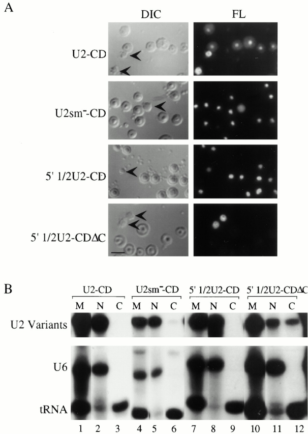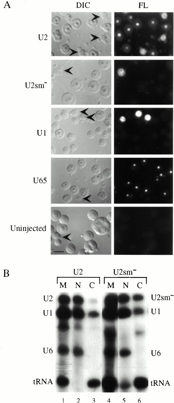 Figure 4. (A) Intranuclear localization of wild-type U2 and Sm-mutant U2 (U2smâ) snRNAs. 1 fmol of 32P- and fluorescently labeled, in vitroâtranscribed U2, Sm-mutant U2, U1, or U65 was injected into Xenopus oocyte nuclei. Nuclear spreads were prepared 5 h later. U1 was included as a positive control for Cajal body localization and as a negative control for nucleolar localization (Narayanan et al. 1999). U65 snoRNA served as a positive control for nucleolar localization and as a negative control for Cajal body localization (Narayanan et al. 1999). A nuclear spread prepared from an uninjected oocyte was included to control for background fluorescence of the preparations. The nuclear spreads were analyzed by DIC and fluorescence (FL) microscopy. Each panel includes several nucleoli and a few Cajal bodies. Cajal bodies are indicated by arrowheads in the DIC panels. (B) Nucleocytoplasmic distribution of U2 and Sm-mutant U2 (U2smâ) snRNAs. Injected oocytes from the same batch analyzed above were dissected into nuclear and cytoplasmic fractions after 5 h. Samples were analyzed by denaturing PAGE and autoradiography to determine the stability and nucleocytoplasmic distribution of the injected RNAs. tRNA was used as a positive control for export and U6 served as a nuclear retention control (Narayanan et al. 1999; Speckmann et al. 1999). Nuclear (N) RNAs are in lanes 2 and 5, cytoplasmic (C) RNAs are in lanes 3 and 6, and marker (M) lanes 1 and 4 show RNAs before injection. Bar, 10 μm.
