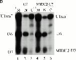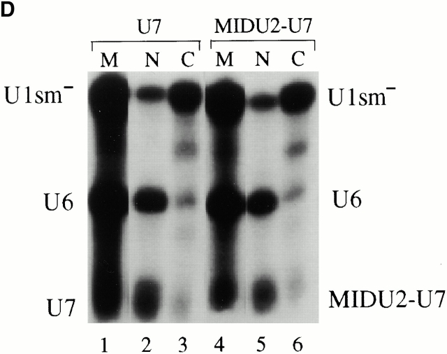 Figure 7. (A) Structures of Xenopus wild-type U7 snRNA and MIDU2-U7 chimera are shown schematically. The U7 Sm binding site is indicated by a hatched box. Thin lines represent the U7 RNA chain. In the MID U2-U7 chimera, the first 18 nucleotides of U7 are substituted with a Xenopus U2 sequence (nucleotides 19â46) indicated by a thicker line. (B) The U7 Sm binding site also supports U2 internal modification. [α32P]UTP uniformly labeled wild-type U7 (lane 1), U2-U7 chimera (MID U2-U7; lane 2), or wild-type U2 (lane 3) was injected into isolated nuclei under oil. 5 h later, RNAs were recovered and assayed for modification. The positions of uridylate and pseudouridylate are indicated. (C) Intranuclear localization of U7 and the U2-U7 chimera. 32P- and fluorescently labeled wild-type U7 and MID U2-U7 chimera were synthesized by in vitro transcription and 1 fmol of each RNA was microinjected into the nuclei of Xenopus oocytes. Nuclei were isolated 5 h later and nuclear spreads were prepared. Spreads were also prepared from uninjected oocytes as controls. DIC and fluorescence (FL) images are shown for each field. The arrowheads in the DIC panels point to Cajal bodies. Prominent Cajal body labeling was observed for both U7 and the MID U2-U7 chimera. Weak but above background nucleolar signal was also detected for the MID U2-U7 chimera. (D) The nucleocytoplasmic distribution of U7 and the U2-U7 chimera RNAs was determined as described in the legend to Fig. 4 B. Bar, 10 μm.