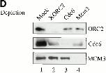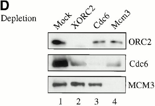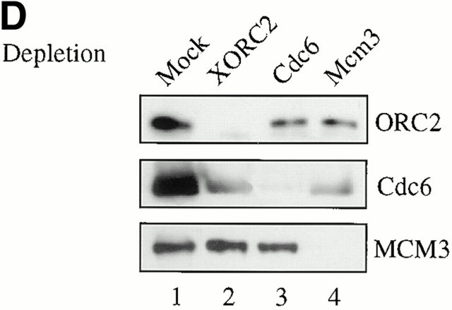 Figure 3. To assemble onto chromatin, cyclin E–Cdk2 requires an activity present in HSS that minimally contains ORC and Cdc6. (A) HSS was diluted with XB2 buffer before the addition of λ DNA templates and baculovirus cyclin E–Cdk2 for a 30-min incubation. Assembled chromatin was isolated and analyzed as in Fig. 1. Lane 1, no DNA; lanes 2–6, DNA templates assembled in HSS that was undiluted, or diluted 1:1, 1:3, 1:7, or 1:11 with XB2. (B) HSS was either left untreated (lanes 1–3), heat treated (lane 4), ATP depleted (lane 5), or supplemented with 10 mM MgCl2 (lane 6) before the addition of λ DNA templates (lanes 2–6). Purified baculovirus-expressed cyclin E–Cdk2 was also added to samples in lanes 3–6. Assembled chromatin was isolated and analyzed as above. (C) Individual aliquots of HSS were immunodepleted with antibodies specific to XORC2 (lanes 3 and 6), XCdc6 (lanes 4 and 7), XMCM3 (lane 5), or with beads alone (lane 2). Specific samples were supplemented with purified XORC complex (lanes 6 and 8) or baculovirus-expressed XCdc6 (lanes 7 and 8). All samples included baculovirus-expressed Xcyclin E–Cdk2 and an energy regenerating system. Depleted samples with and without additions were incubated with λ DNA for 30 min, sedimented through a sucrose cushion, and resolved by SDS-PAGE. (D) Western blots of depleted HSS used for assembling chromatin in C. Lane 1, mock depleted; lane 2, ORC2 depleted; lane 3, Cdc6 depleted; lane 4, MCM3 depleted.