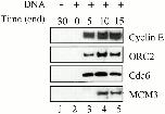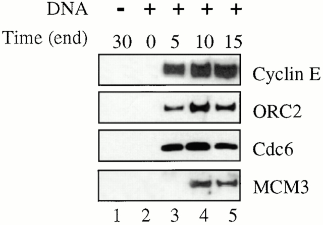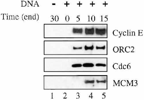 Figure 2. The cyclin E–Cdk2 complex from HSS associates with chromatin with kinetics similar to ORC and Cdc6, but earlier than MCM3. Chromatin was assembled by addition of sperm DNA to HSSs from Xenopus egg extracts, and reactions were stopped at indicated times. Chromatin templates were isolated, resolved by SDS-PAGE, and analyzed by Western blotting with antibodies to Xenopus ORC2, Cdc6, MCM3, and cyclin E (Materials and Methods). Lane 1, no DNA, 30 minutes; lanes 2–5, DNA templates assembled for 0, 5, 10, or 15 min. Later time points showed no additional assembly of ORC, Cdc6, MCM3, or cyclin E–Cdk2.