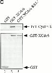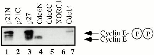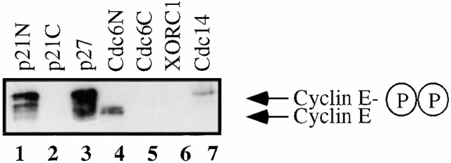 Figure 4. Purified cyclin E–Cdk2 binds directly to Cdc6. Baculovirus-expressed cyclin E–Cdk2 was incubated for 30 min with an energy regeneration system and purified GST fusion proteins including GST–p21N1–90 (lane 1), GST–p21C87–164 (lane 2), GST–p27 (lane 3), GST–Cdc6N2–168 (lane 4), GST–Cdc6C169–554 (lane 5), GST–XORC1 (lane 6), or GST–hCdc14 (lane 7). Reactions were diluted in IP buffer and bound to glutathione–agarose beads. Beads were washed and resolved by SDS-PAGE, and cyclin E was visualized by Western blotting.
