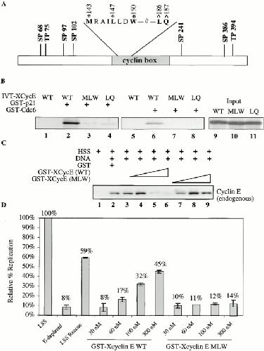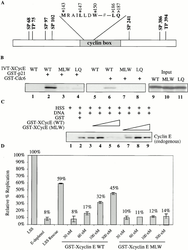 Figure 5. The MRAIL motif of cyclin E is required for binding of cyclin E to Cdc6, recruitment of cyclin E–Cdk2 to DNA, and replication competence. (A) Schematic of the Xenopus cyclin E protein. The shaded area indicates the cyclin box. Within this region, the specific amino acids mutated for the MLW mutant (*) and the LQ mutant (^). Putative phosphorylation sites are also depicted, proceeded by the amino acid number of the specific serine or threonine residue. (B) Wild-type Xenopus cyclin E (lanes 1, 2, 5, and 6), or cyclin E with mutations in the MLW (lanes 3 and 7) or the LQ (lanes 4 and 8) peptide sequences were radiolabeled by in vitro translation in rabbit reticulocyte lysate. The IVT cyclin E variants were added to bacterially expressed GST–p21N (lanes 1–4) or GST–XCdc6 (lanes 5–8), incubated for 30 min, and diluted in IP buffer. GST–p21- and GST–Cdc6-associated cyclin E–Cdk2 was precipitated with glutathione–agarose beads. Beads were washed and resuspended in sample buffer, and proteins were resolved by SDS-PAGE and visualized by autoradiography. Lanes 9–11 show a matched exposure of the amount of input IVT cyclin E used in the binding experiments. (C) HSS was supplemented with buffer (lanes 1 and 2), with 100 nM GST (lane 3) or increasing doses (30, 60, or 100 nM) of wild type (lanes 4–6), or MRAIL mutant (lane 7–9) GST–Xcyclin E. After preincubating the HSS with the GST proteins, λ DNA templates were added to extracts (lanes 2–9), and assembled chromatin was isolated and resolved by SDS-PAGE and blotted for the presence of endogenous cyclin E. The lack of a cyclin E signal in lanes 5 and 6 indicates that wild-type GST–Xcyclin E can effectively compete away chromatin binding of endogenous cyclin E at the indicated concentrations. (D) LSS was immunodepleted with cyclin E antibodies conjugated to protein A–Sepharose beads. Depleted samples were supplemented with undepleted LSS, increasing concentrations of wild type, or MRAIL mutant GST–Xcyclin E, as noted, before the addition of sperm DNA, an energy regenerating system, and [α-32P]dCTP. Replication was assayed and quantitated in duplicate samples as described in Materials and Methods and plotted as a percentage, normalizing the amount of replication in undepleted LSS to 100%. This corresponds to 1.7 ng/μl of new DNA synthesized from the 2.5 ng/μl of DNA added.