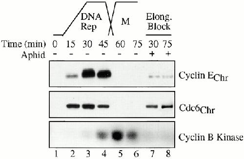 Figure 7. Replication elongation is required for cyclin E accumulation on chromatin. Cycling LSS extracts were incubated with sperm DNA for the indicated times in the absence (lanes 1–6) or the presence (lanes 7 and 8) of aphidicolin (Aphid; 40 μg/ml) before isolating chromatin templates by sedimentation and resolving chromatin-associated proteins by SDS-PAGE. Top shows Western blots for cyclin E and Cdc6, which remain bound to chromatin in varying amounts throughout DNA replication (DNA rep). Later time points showed no additional assembly of cyclin E onto chromatin in aphidicolin-treated samples. Bottom shows IP kinase assays of samples identical to those above. Anti–cyclin B antibodies conjugated to protein A–Sepharose beads were used to immunoprecipitate cyclin B, and associated kinase activity was assayed by in vitro phosphorylation of histone H1 in the presence of γ[32P]ATP. The peak in cyclin B kinase activity indicates that the extracts are in mitosis (M).