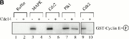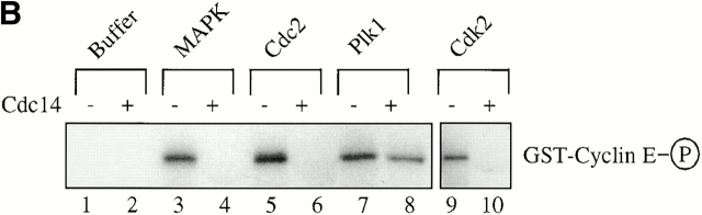 Figure 8. Specific mitotic kinases are capable of phosphorylating cyclin E and displacing cyclin E–Cdk2 from chromatin; Cdc14 can oppose phosphorylation by these kinases. (A) Sperm chromatin assembled in interphase LSS (in the presence of cycloheximide) for 1 h was subsequently treated with buffer (lane 1), 1 U of MAP kinase (lane 2), cyclin B–Cdc2 (lane 3), Plk1 (lane 4), or 10 μM okadaic acid (lane 5) for 10 min. Chromatin was extracted, and associated proteins were resolved by SDS-PAGE and Western blotted for the presence of cyclin E or ORC. (B) Purified GST–Xcylin E was incubated with buffer (lanes 1 and 2), MAP kinase (lanes 3 and 4), cyclin B–Cdc2 (lanes 5 and 6), Plk1 (lanes 7 and 8), or cyclin E–Cdk2 (lane 9–10) in the presence of γ[32P]ATP. After 30 min, 2 μM GST–Cdc14 was added to indicated samples (lanes 2, 4, 6, 8, and 10), and all samples were incubated for an additional 30 min. Reactions were resolved by SDS-PAGE, and phosphorylated GST–cyclin E was visualized by autoradiography.