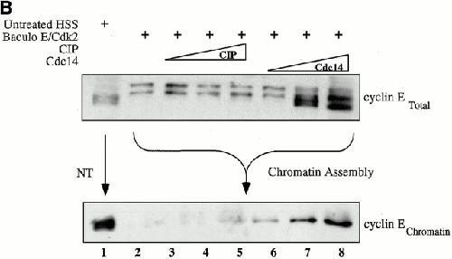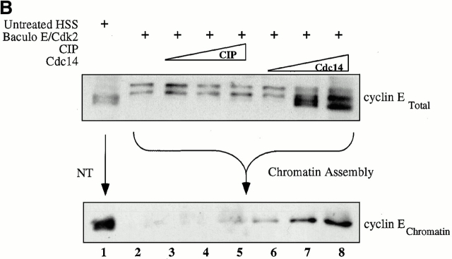Figure 9. Cdc14 reverses the inability of mitotic hyperphosphorylated cyclin E to bind to chromatin. (A) Interphase extract (lanes 1–4) or mitotic extract stabilized by the addition of nondestructible cyclin B (lanes 5–8) was supplemented with buffer (lanes 1 and 4), 10 μM okadaic acid (OA; lanes 2 and 6), 1 μM GST–Cdc14 (lanes 3 and 7), or both okadaic acid and Cdc14 (lanes 4 and 8) and incubated at 23°C for 30 min. Reactions were stopped by adding sample buffer, proteins were resolved by SDS-PAGE, and Western blots were performed with cyclin E antibodies to detect the various phosphorylated forms of cyclin E. (B) Baculovirus-expressed Xenopus cyclin E–Cdk2 in an autohyperphosphorylated form was mixed with buffer (lane 2), increasing concentrations of the CIP phosphatase (lanes 3–5), or increasing concentrations of GST–Cdc14 (lanes 6–8) for 30 min. Untreated HSS (lane 1) and treated samples were resolved by SDS-PAGE and analyzed by Western blotting with antibodies to cyclin E (top). The samples in lanes 2–8 were incubated with λ DNA templates and a small amount of HSS (bottom). Assembled chromatin was isolated by sedimentation, and proteins were resolved by SDS-PAGE and analyzed by Western blotting with anti–cyclin E antibodies. The sample in lane 1 is HSS that was not treated (NT).