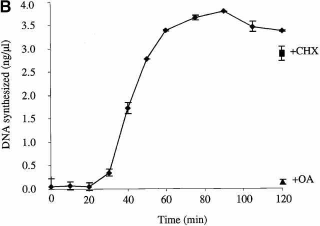 Figure 1. Cyclin E associates with chromatin in LSS after nuclear import. (A) Sperm chromatin was assembled in the presence of cycling LSS at 23°C for 0–2 h (time of assembly shown beneath blots) before spinning through a sucrose cushion to isolate nuclei in duplicate. One nuclear sample was extracted with chromatin extraction buffer and respun to isolate chromatin-associated proteins. Cytosolic, nuclear, and chromatin-associated samples were resolved by SDS-PAGE and analyzed by Western blotting with ORC or cyclin E antibodies. Schematics above blots depict the timing of relevant events including, nuclear import (NI), DNA replication (DNA repl), cyclin E association with chromatin (Cyc E on Chrom), and mitosis (M). The indicated samples were supplemented with 10 μM okadaic acid (OA) or 100 μg/ml cycloheximide (CHX) for 120 min. (B) Samples identical to those in A were supplemented with [α-32P]dCTP. At each time point, the reactions were stopped, and the amount of DNA synthesized in duplicate samples was quantitated as detailed in Materials and Methods.