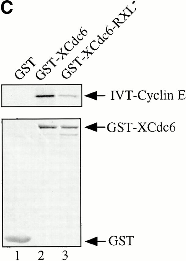 Figure 6. RXL mutants of Cdc6 show a quantitative defect in their ability to bind to cyclin E, to get phosphorylated by cyclin E–Cdk2, and to sustain replication in Cdc6-depleted extract. (A) LSS was immunodepleted with affinity-purified XCdc6 antibodies conjugated to protein A–Sepharose beads. Depleted samples were supplemented with sperm DNA, an energy regenerating system, α[32P]dCTP, and 1, 5, 10, 20, 30, or 100 nM of either wild-type GST–XCdc6 (♦) or GST-XCdc6 with all three RXL motifs mutated to AXA (▪) (see Materials and Methods for mutant description). Replication was quantitated as indicated in Materials and Methods and plotted as a percentage of undepleted extract, normalizing to 100% rescue in mock-depleted extracts and setting 0% replication as the amount of background counts incorporated after depletion. (B) Purified GST (lane 1), wild-type GST–XCdc6 (lane 2), or triple RXL mutant GST–XCdc6 (lane 3) was incubated with purified baculovirus-expressed cyclin E–Cdk2 in the presence of γ[32P]ATP. Proteins were resolved by SDS-PAGE, and phosphorylated proteins were visualized by autoradiography. Membrane stained with Ponceau S is shown below as a loading control. (C) Purified GST (lane 1), wild-type GST–XCdc6 (lane 2), or triple RXL mutant GST–XCdc6 (lane 3) was incubated with radiolabeled IVT Xcyclin E. After a 30-min incubation, samples were diluted in IP buffer, and GST proteins were precipitated with glutathione–agarose beads and washed. Beads were resuspended in sample buffer, and associated proteins were resolved by SDS-PAGE and visualized by autoradiography. Membrane stained with Ponceau S is shown below as a loading control.