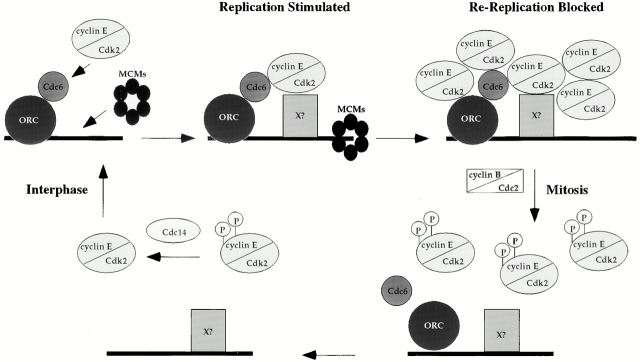 Figure 10. Model of the cell cycle–regulated association of cyclin E–Cdk2 with chromatin and its effects on DNA replication and rereplication control. In a first phase, cyclin E–Cdk2 is recruited to origins of DNA replication by ORC, Cdc6, and possibly an unknown factor (X?). In this conformation, with MCMs bound, DNA replication is initiated. In a second phase, dependent on the progression of replication forks, multiple molecules of cyclin E accumulate on chromatin, blocking re-replication. In a final phase, cyclin E is hyperphosphorylated by cyclin B–Cdc2 and stripped from chromatin in mitosis. Rebinding of cyclin E to chromatin in interphase is possible only after dephosphorylation by Cdc14 or a related phosphatase (Discussion).
