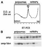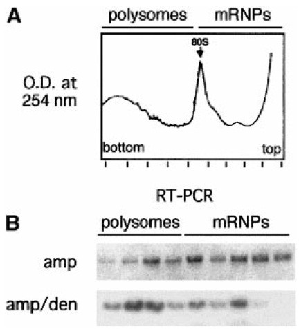 FIG. 3. Polysomes/mRNPs distribution of fgf-2 mRNA. (A) Absorbance