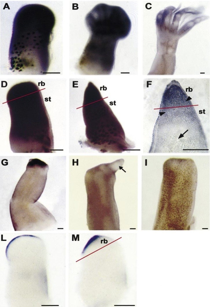 FIG. 1. Whole-mount in situ hybridization with fgf-2 mRNA (A) and fgf-8 mRNA antisense probes (L, M). (A) Normal hindlimbs from larvae at stages 52, 55, and 57, respectively. (A and B) At stage 52 and 55, fgf-2 mRNA expression is detectable in whole the limb, but a distal to proximal gradient of the fgf-2 expression pattern is visible. (C) At stage 57, a low level of fgf-2 mRNA is observed only at level of the distalautopodium (toes). (D) Regenerating hindlimbs amputated through the tarsalia and denervated, stage 52. (D and E) Three and five days after operation, respectively. A high level of fgf-2 mRNA expression is observed both in the stump and in the regeneration blastema. Red lines indicate the approximate amputation level. (F) Longitudinal section of the same blastema in E. fgf-2 mRNA is confined to mesenchymal cells in the stump and in the regeneration blastema (arrowheads). In the procartilaginous skeleton of the stump (arrow), fgf-2 mRNA is undetectable. The line marks the approximate boundary between the stump and regeneration blastema. (G) Hindlimbs amputated through the tarsalia, stage 57. (G) Three days after amputation and sham-denervation: fgf-2 mRNA expression is evident only in the most distal part of the stump in close proximity to the amputation surface. (H) Nine days after amputation and sham-denervation: fgf-2 mRNA is undetectable both in the stump and in the blastema (arrow). (I) Nine days after amputation and denervation. No blastema is present and fgf-2 mRNA is undetectable in the stumped limb. (L and M) fgf-8 expression in hindlimbs of stage 52 larvae. In the normal limb (L), fgf-8 is expressed in the distalepidermis. In the regenerating limb (M), fixed 4 days after amputation, fgf-8 is expressed in the apical epithelial cap covering the regeneration blastema. rb, regeneration blastema; st, stump. Scale bar, 500 ï°m.
