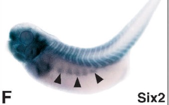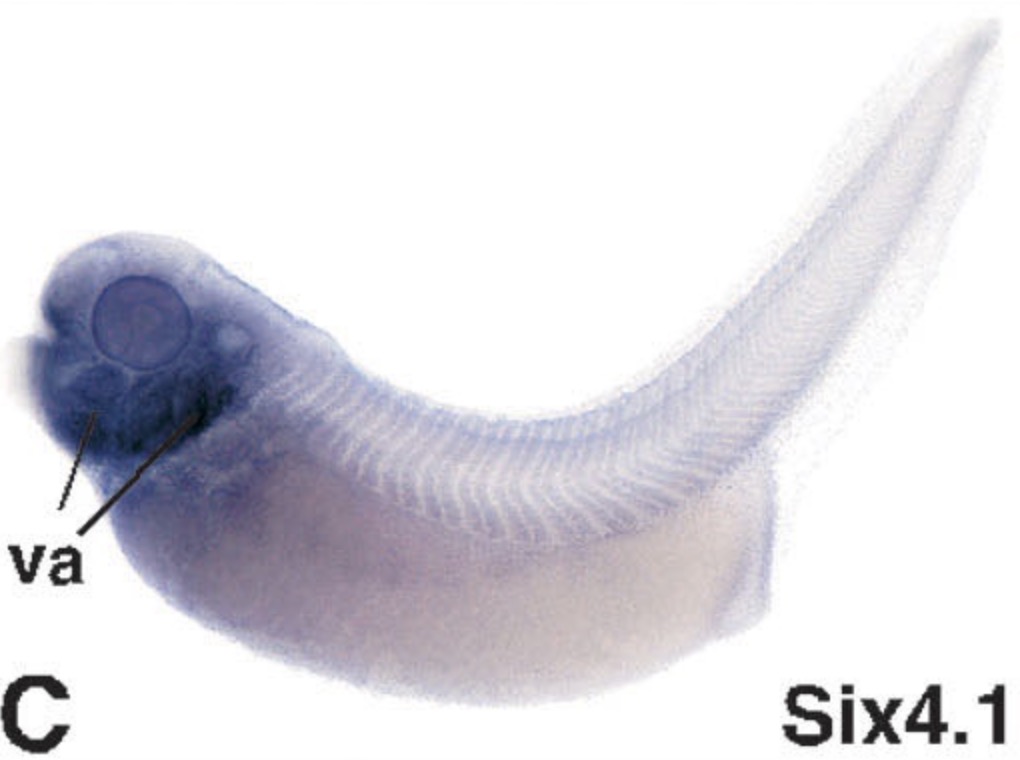 six4 (SIX homeobox 4) gene expression in Xenopus laevis embryo, assayed via in situ hybridization, NF stage 39, lateral view, anterior left, dorsal up.