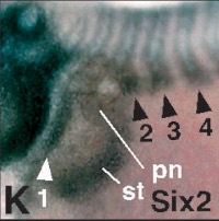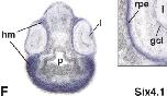 six4 (SIX homeobox 4) gene expression in Xenopus laevis embryo, transverse sections through the head, assayed via in situ hybridization, NF stage 39, dorsal up, and higher magnification of sectioned eye (right).