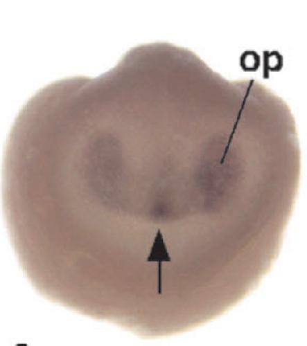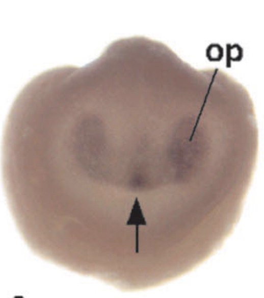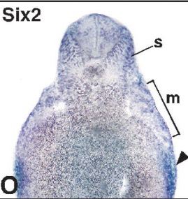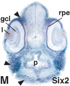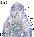 six6 (SIX homeobox 6) gene expression in Xenopus laevis embryo, assayed via in situ hybridization, NF stage 20, anterior view, dorsal up