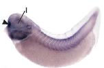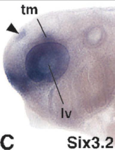 six3 (SIX homeobox 3) gene expression in Xenopus laevis embryo, assayed via in situ hybridization, NF stage 39, lateral view, anterior left, dorsal up