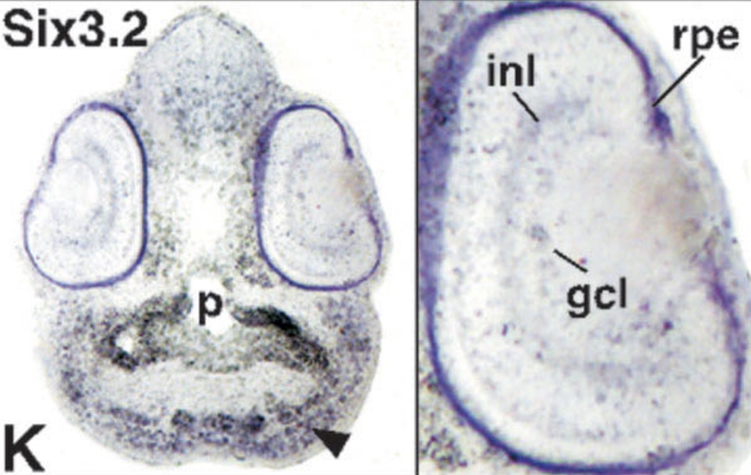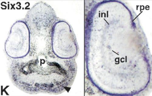 Key: rpe: retinal pigmented epithelium; inl= inner nuclear layer; gcl= ganglionic cell layer, p=pharyngeal endoderm; arrow head: head mesenchyme.