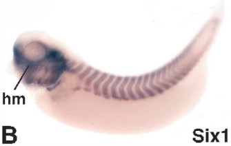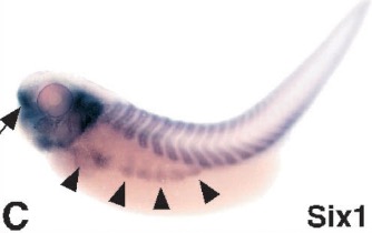 six1 (SIX homeobox 1) gene expression in Xenopus laevis embryo, assayed via in situ hybridization, NF stage 39, lateral view, anterior left, dorsal up.