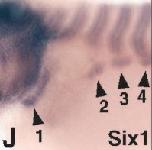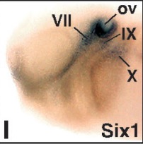six1 (SIX homeobox 1) gene expression in Xenopus laevis embryo, transverse sections through the head, assayed via in situ hybridization, NF stage 39, dorsal up.