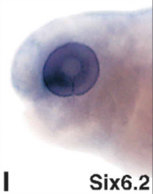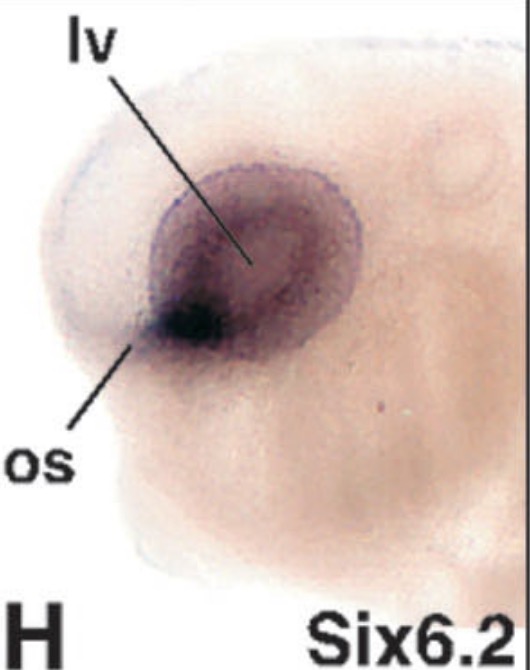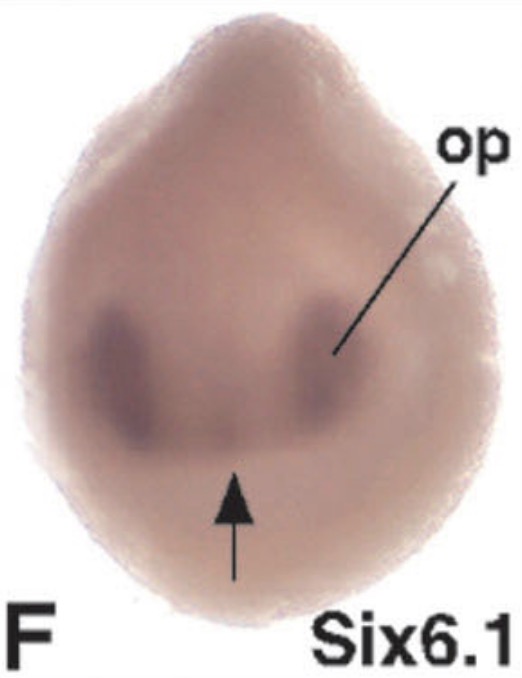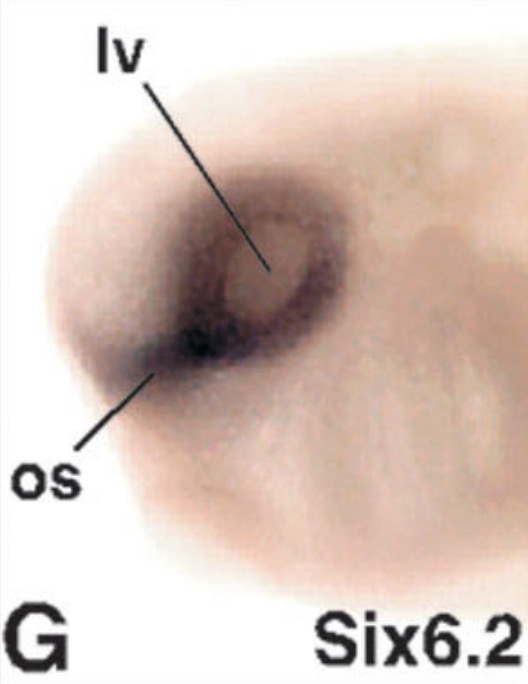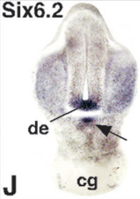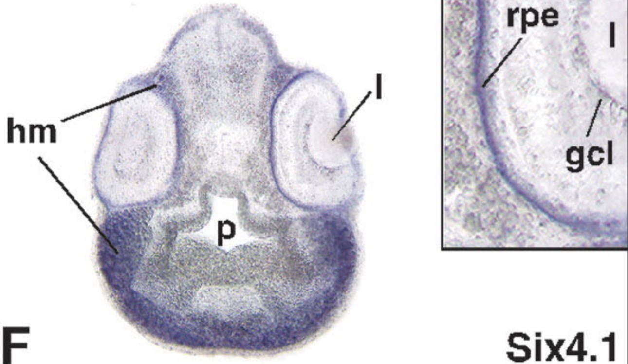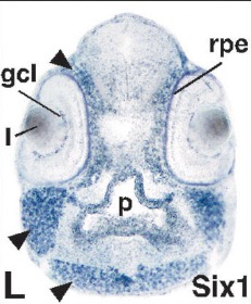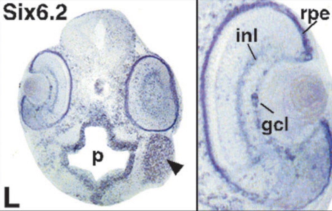 six6 (SIX homeobox 6) gene expression in Xenopus laevis embryo, transverse sections through the head, assayed via in situ hybridization, NF stage 39, dorsal up, and higher magnification of sectioned eye (right).