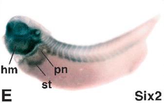six2 (SIX homeobox 2) gene expression in Xenopus laevis embryo, assayed via in situ hybridization, NF stage 28/29, lateral view, anterior left, dorsal up.