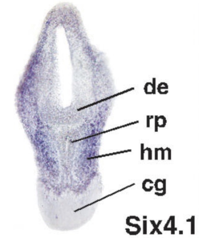 Key:hm= head mesenchyme; de= diencephalon; rp= Rathke's pouch; cg; cement gland.