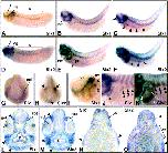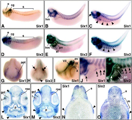 Fig. 2. Analysis of Six2 subfamily gene expression during Xenopus development by whole-mount in situ hybridization. Lateral views are shown in (AâF,IâK) with anterior to the left. Frontal views (G,H) and the sections (LâO) are oriented with dorsal to the top. (AâC) Six1 expression in stage 30 (A), stage 35 (B) and stage 39 (C) embryos. The arrow in panel (C) indicates the olfactory bulbs and the arrowheads highlight the migrating ventral muscle anlagen. (DâF) Six2 expression in stage 30 (D), stage 35 (E) and stage 39 (F) embryos. The arrowheads in panel (F) indicate ventral muscle anlagen. (G,H) Frontal views of stage 20 embryos showing Six1 (G) and Six2 (H) gene expression. The olfactory (arrowhead) and otic placodes (arrows) are indicated in panel H. (I) Close-up view of a stage 30 embryo head illustrating Six1 expression associated with facial (VII), glossopharyngeal (IX) and vagus (X) ganglia. (J,K) Close-up views of stage 35 embryos demonstrating Six1 (J) and Six2 (K) expression in the 1stâ4th ventral abdominal muscle anlagen (arrowheads). (L,M) Transverse sections through the head of stage 39 embryos illustrating Six1 (L) and Six2 (M) expression. Arrowheads highlight expression in the head mesenchyme. (N) Transverse section through the midtrunk of a stage 39 embryo. Arrowheads indicate Six1 expression in migrating abdominal muscle anlagen. (O) Transverse section at the level of the pronephric kidney through a stage 39 embryo. The abdominal muscle anlagen (arrowhead), and the mesenchyme (m) adjacent to the developing stomach and pronephric kidney epithelia are indicated. Abbreviations: cg, cranial ganglia; e, eye; gcl, ganglion cell layer; hm, head mesenchyme; l, lens; p, pharynx; pn, pronephros; ppt, primitive placodal thickening; rpe, retinal pigment epithelium; s, somites; st, stomach.