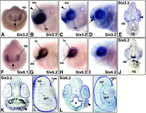 Fig. 3. Expression of Six3 subfamily members during Xenopus head development. (A,F) Frontal views of stage 20 embryos showing Six3.2 (A) and Six6.1 (F) expression in the optic field (op) and future ventral forebrain (arrow). (BâD,GâI) Lateral views of embryonic stages 30 (B,G), 35 (C,H) and 39 (D,I) stained for Six3.2 (BâD) and Six6.2 (GâI). The arrowhead indicates the pineal gland primordium and the arrow highlights the olfactory bulb. (E,J) Transverse head sections of stage 35 embryo at the level of the cement gland illustrating Six3.2 (E) and Six6.2 (J) expression. The developing lens (arrowhead), the ventral floor of the diencephalon (de) and the dorsal portion of Rathke's pouch (arrow) are indicated. (K,L) Transverse sections through the head of stage 39 embryos stained for Six3.2 (K) and Six6.2 (L). The insets illustrate Six gene expression in the eye. Arrowheads indicated head mesenchyme. Abbreviations: cg, cement gland; gcl, ganglion cell layer; inl, inner nuclear layer; lv, lens vesicle; op, optic field; os, optic stalk; p, pharyngeal endoderm; rpe, retinal pigment epithelium; tg, tegmentum.