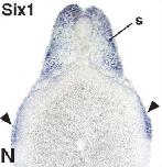 six1 (SIX homeobox 1) gene expression in Xenopus laevis embryo, assayed via in situ hybridization, NF stage 20, anterior view, dorsal up.