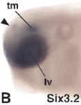 six3 (SIX homeobox 3) gene expression in Xenopus laevis embryo, transverse sections through the head, assayed via in situ hybridization, NF stage 39, dorsal up, and higher magnification of sectioned eye (right).