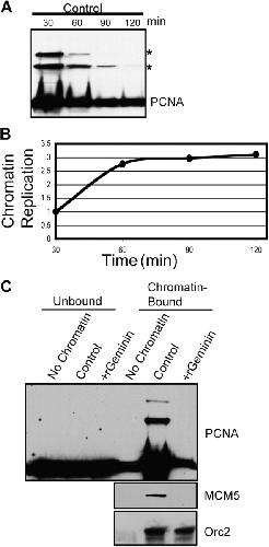 Figure 1. PCNA undergoes secondary modifications during DNA replication. (A) Undamaged sperm chromatin was isolated from X. laevis egg extract after 30, 60, 90, or 120 min. The associated proteins were analyzed by Western blotting using an antibody recognizing PCNA. (B) Duplicate samples from A contained 32P-dATP and DNA replication was measured as described in Materials and methods. (C) Sperm chromatin was incubated in X. laevis egg extract for 30 min with or without 250 μM of recombinant GST-geminin (rGeminin). The chromatin was isolated and resuspended in SDS sample buffer. A sample was also collected from the supernatant fraction to analyze the unbound fraction.