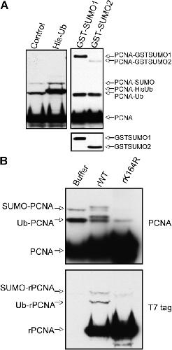 Figure 2. PCNA is monoubiquitylated and sumoylated during DNA replication. (A) X. laevis egg extract was incubated with sperm chromatin and either buffer, 0.5 μg/μL His-tagged ubiquitin, 0.5 μg/μL GST-SUMO1, or 0.5 μg/μL GST-SUMO2. Chromatin was isolated and analyzed by Western blotting with an antibody recognizing PCNA. The bottom blot shows a Western blot, using an antibody recognizing GST, of the sample before chromatin isolation. (B) X. laevis egg extract was incubated with sperm chromatin and either buffer, 200 ng/μL T7-PCNA (rWT), or 200 ng/μL T7-PCNA (rK164R). Chromatin was isolated and analyzed by immunoblotting with an antibody recognizing either PCNA or the T7 tag.