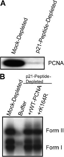 Figure 3. PCNA modification is not required for M13 replication. (A) p21-peptide beads were used to deplete PCNA from X. laevis egg extract as described in Materials and methods, and the resulting extracts were analyzed by SDS-PAGE and Western blotting using an antibody recognizing PCNA. (B) Either mock- or peptide-depleted extract was incubated with M13 DNA for 30 min. The peptide-depleted extract was supplemented with buffer, 0.2 μg/μL PCNA (wild type), or 0.2 μg/μL PCNA (K164R). The samples were then analyzed for DNA replication as described in Materials and methods.