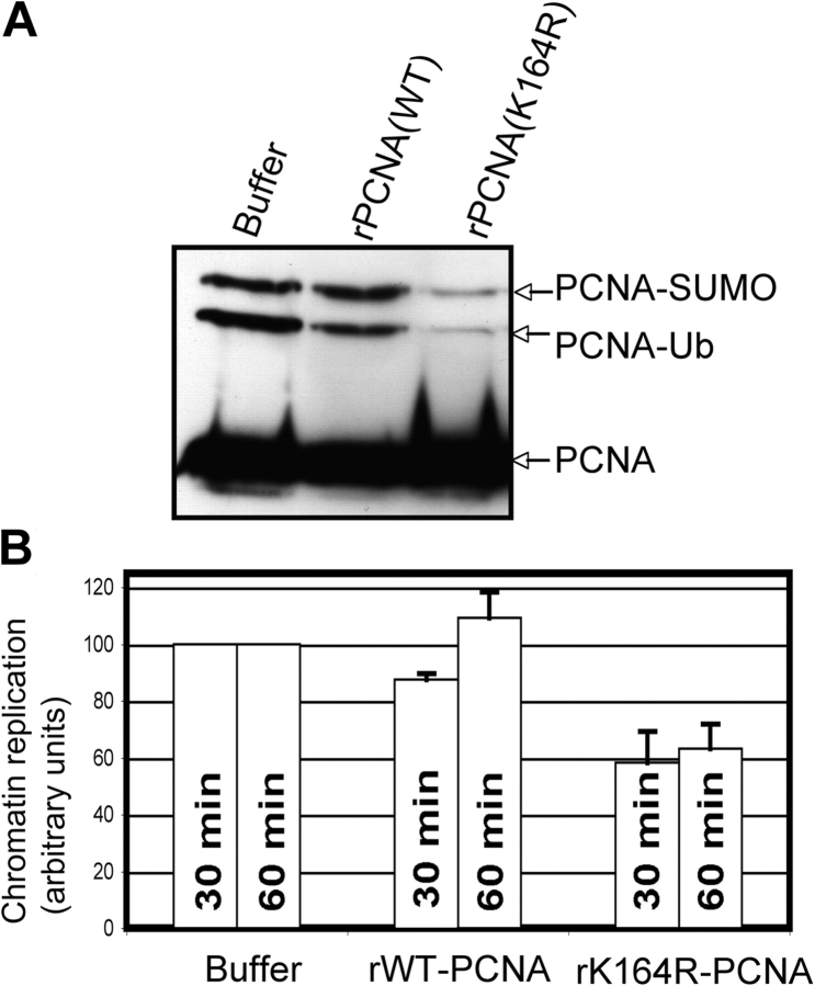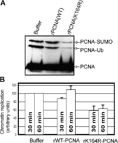 Figure 5. Ubiquitylation of PCNA facilitates sperm chromatin replication. (A) Sperm chromatin was incubated in X. laevis egg extract supplemented with buffer, 0.2 μg PCNA (wild type), or 0.2 μg PCNA (K164R) for 45 min. The chromatin was then isolated and analyzed by SDS-PAGE followed by Western blotting with an antibody recognizing PCNA. (B) Duplicate samples containing 32P-dATP were used to measure DNA replication after 30 and 60 min as described in Materials and methods. The average of three independent experiments is shown with error bars representing the SEM.