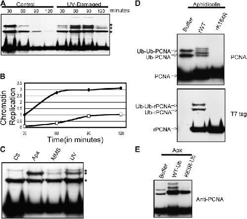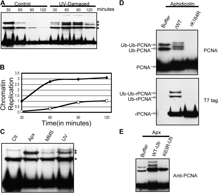 Figure 8. DNA damage induces polyubiquitylation of PCNA. (A) UV-damaged sperm chromatin was isolated from X. laevis egg extract after 30, 60, 90, or 120 min. The associated proteins were analyzed by Western blotting using an antibody recognizing PCNA. The control portions of this experiment are reproduced from Fig. 1 A to facilitate comparison. (B) Duplicate samples from A contained 32P-dATP and DNA replication was measured as described in Materials and methods. Closed circles represent undamaged chromatin and open squares represent UV-damaged chromatin. (C) Undamaged chromatin, MMS-damaged chromatin, or UV-damaged chromatin was isolated from X. laevis egg extract after 45 min. Aphidicolin was added to 100 μg/ml at t = −10 min to the extract incubated with undamaged chromatin. The associated proteins were analyzed by Western blotting using an antibody recognizing PCNA. (D) X. laevis egg extract, preincubated with 100 μg/ml aphidicolin, was incubated with sperm chromatin and either buffer, 0.2 μg/μL T7-PCNA (rWT), or 0.2 μg/μL T7-PCNA (rK164R). Chromatin was isolated and analyzed by immunoblotting with an antibody recognizing either PCNA or the T7 tag. (E) X. laevis egg extract was preincubated with 100 μg/ml aphidicolin. Undamaged sperm chromatin was incubated in this extract which also contained buffer, 0.5 μg/μL His-tagged ubiquitin, or 0.5 μg/μL His-tagged ubiquitin (K63R). Chromatin was isolated and the bound proteins were analyzed by Western blotting with an antibody recognizing PCNA.