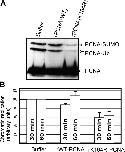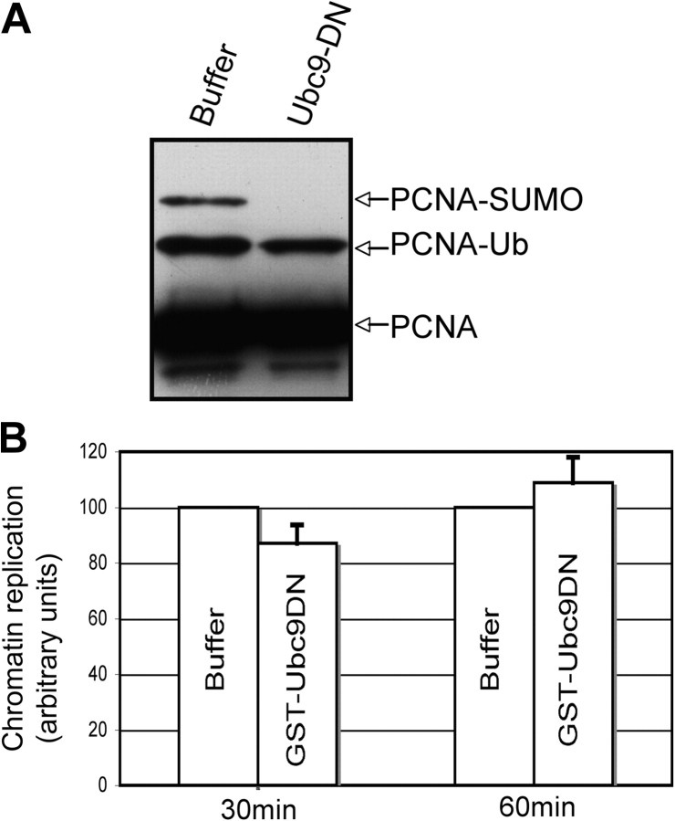 Figure 4. Sumoylation of PCNA is not required for sperm chromatin replication. (A) X. laevis egg extract was supplemented with either buffer or 5 μg/μL GST-Ubc9 dominant-negative protein (Ubc9-DN). Sperm chromatin was incubated in these extracts for 30 min and isolated. The resulting samples were subjected to SDS-PAGE and Western blotting using an antibody recognizing PCNA. (B) Duplicate samples containing 32P-dATP were used to calculate the amount of DNA replication occurring in these samples after 30 and 60 min as described in Materials and methods. The average of three independent experiments is shown with error bars representing the SEM.