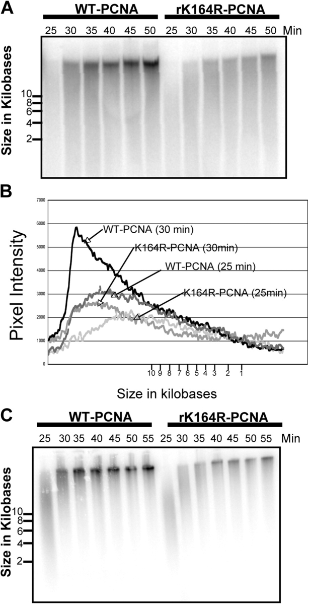 Figure 6. Loss of PCNA ubiquitylation slows replication fork progression. (A) Sperm chromatin was incubated in X. laevis egg extract containing either 0.2 μg/μL PCNA (wild type) or 0.2 μg/μL PCNA (K164R). Aliquots were removed after 25, 30, 35, 40, 45, and 50 min and prepared for alkaline agarose gel analysis as described in Materials and methods. (B) Fragment lengths were calculated by comparison to a DNA ladder and plotted against pixel intensity obtained with National Institutes of Health Image software. (C) Sperm chromatin was incubated in X. laevis egg extract containing either 0.2 μg/μL PCNA (wild type) or 0.2 μg/μL PCNA (K164R). Cold dATP was added after 25 min. Aliquots were removed after 25, 30, 35, 40, 45, and 50 min and prepared for alkaline agarose gel analysis as described in Materials and methods.
