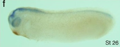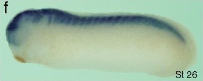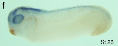 zic1 (Zic family member 1) gene expression in Xenopus laevis embryo via in situ hybridization, NF stage 26, lateral view, anterior left, dorsal up.