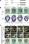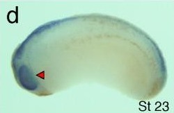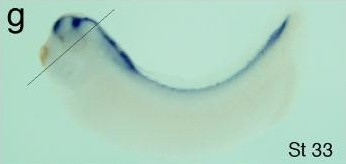 Figure 2. Expression profiles of Xenopus laevis Zic genes during embryonic development. Whole-mount in situ hybridization (WMISH) analyses with digoxigenin-labeled probes were performed to determine the spatial expression patterns of each Zic gene during development. Uppercase labels represent embryos stained with a Zic probe (A, Zic1; B, Zic2; C, Zic3; D, Zic4; E, Zic5). Lowercase labels indicate embryo stages (a, stage 11.5; b, 15; c, 19; d and e, 23; f, 26; g-i, 33). In b, arrows indicate the prospective region of hyoid crest and branchial crest, which have high Zic1 and Zic4 expression, and arrowheads show the anterior neural plate border region, with high levels of Zic5. e is the frontal view of the embryo shown in d. Arrowheads in d and e indicate the expression in eye (red), somite (green), lateral mesoderm (blue), and olfactory placode (white). h is a higher-magnification view of the embryo shown in g. i shows the transverse section of the WMISH sample of stage 33. The position of the section in i is indicated by a thin line in g. nt, neural tube; nc, notochord; ey, eye.