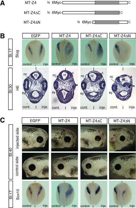 Figure 3. Effects of Zic4 truncation. A: Schema of the structures of Zic4 (MT-Z4) and C- or N-terminal truncated mutants (MT-Z4δC and MT-Z4δN). All constructs were designed with 6 Myc tags at the N-terminus. Gray boxes illustrate ZF. B: Top panels are WMISH analyses of MT-Z4 or truncated-mutant-injected embryos (St. 17) with antisense digoxigenin-labeled Slug probe. RNA (200 pg) was injected in the right side of the embryo (inje.) with EGFP RNA (400 pg). Injected constructs are shown on the top of each panel. EGFP indicates that the control embryos were injected with EGFP only. The left side of the embryo is the uninjected control. Bottom panels are sections of the head region of each injected embryo (St. 30 to 32). Injected constructs and their amounts are the same as in the top panels. The typical sections were stained by hematoxylin and eosin. Arrowheads indicate the abnormality of the injected embryo (white, hyperplasia of neural tube; black, eye formation disturbance; red, neural tube closure defect). nt, neural tube; nc, notochord; ey, eye. C: Top (injected side) and middle (control side) panels are embryos (St. 40 to 42) in which MT-Z4 or truncated mutants were injected. We used less RNA (MT-Z4, 150 pg; MT-Z4δC, 150 pg; MT-Z4δN, 100 pg) than in B to increase the survival rate. The eye abnormalities were less frequently observed (MT-Z4, 5/13; MT-Z4δN, 5/9) at this dose, and normal ones are presented. Yellow arrowheads indicate ectopic melanocytes induced by MT-Z4 RNA injection. We also noticed an increase in small brown pigment cells (Fig. 4C, red arrowheads) in almost all cases (MT-Z4, 10/13; MT-Z4δC, 5/9; and MT-Z4δN, 9/9). The small cells could be seen at stages before melanocytes were formed, but the cells were not stained by whole-mount in situ hybridization using Dct (DOPA chrome tautomerase, an enzyme related to the eumelanin synthesis) probe (data not shown). Bottom panels are WMISH analyses of MT-Z4 or truncated-mutant-injected embryos (St. 17) with antisense digoxigen-labeled Sox10 probe. The embryos shown in the bottom panels are siblings of embryos shown in the top panels, used in the same experiments. RNA (MT-Z4 and MT-Z4δC, 150 pg; MT-Z4δN, 100 pg) was injected in the right side of embryos with EGFP RNA (400 pg). Injected constructs are shown at the top of each panel. EGFP means that the control embryos were injected only with EGFP. The left side of the embryo is the uninjected control.
