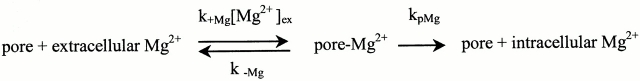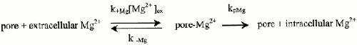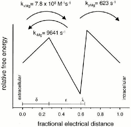 Figure 6. Energy profile for Mg2+ block and permeation. The rate constants pertain to extracellular Mg2+ in pure water (no competing ions) and with no membrane potential. The fractional electrical distances are indicated below, where δ pertains to the Mg2+ entry barrier (= 0.25), ɛ pertains to the Mg2+ dissociation (= 0.35), and λ pertains to the Mg2+ permeation barrier (= 0.03). The Mg2+ binding site is 0.60 through the electric field from the extracellular solution.
