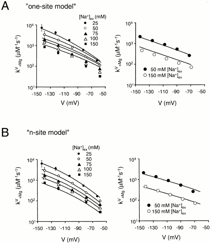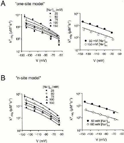 Figure 4. Number and affinities of Na+ binding sites. The Mg2+ association rate constant was used to probe the occupancy of the channel by Na+. Data obtained in 100 mM [Na+]in are shown to the left, and data obtained in 5 mM [Na+]in are shown to the right. (A) Fits of experimental Mg2+ association rate constants assuming one Na+ binding site (). The apparent Mg2+ association rate constant obtained from different [Na+]ex is plotted as a function of the membrane potential. A model with a single Na+ binding site does not provide an adequate description of the experimental results. (B) Fits of the same experimental data by an “n-site” scheme (). The solid lines are the predicted curves from the model (parameters for the best fit are shown in Table ). The model with n = 2 independent Na+ sites is better (MSC = 5.5) than the model with a single Na+ site (MSC = 4.0).