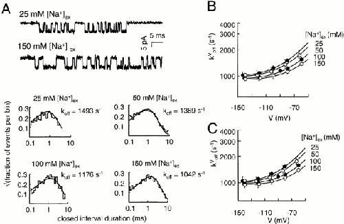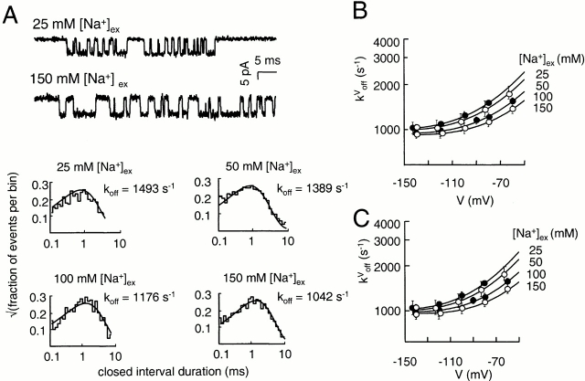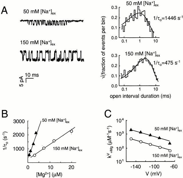 Figure 2. Effects of extracellular Na+ on the Mg2+ association rate constant. (A, left) Single-channel currents recorded at different [Na+]ex ([Mg2+]ex = 3 μM, [Na+]in = 5 mM; V = −80 mV). (A, right) Open interval duration distributions. Open intervals are longer (i.e., block by Mg2+ is slower) at higher [Na+]ex. (B) The inverse open channel lifetime (1/τo) versus [Mg2+]ex. Increasing extracellular [Na+] reduces the slope (which is equal to the Mg2+ association rate constant) about fivefold, from 500.0 ± 35.6 μM−1s−1 in 50 mM [Na+]ex to 109.6 ± 6.9 μM−1s−1 in 150 mM [Na+]ex. (C) The Mg2+ association rate constant versus membrane potential, at different [Na+]ex. The solid line is the fit by . The apparent voltage dependence of the Mg2+ association rate constant is the same in 50 mM and 150 mM [Na+]ex (43 ± 2 mV and 44 ± 1 mV per e-fold change, respectively). In B and C, the SD is smaller than the symbols for all except one point.