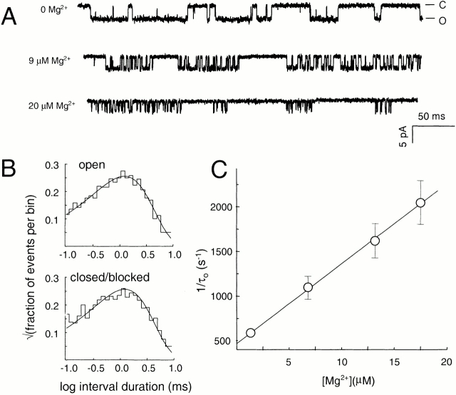 Figure 1. Block of NR1-NR2A NMDA receptors by extracellular Mg2+. (A) Single-channel currents from NR1-NR2A NMDA receptors recorded from outside-out patches in the absence and presence of extracellular Mg2+. Currents were activated by 50 μM NMDA and 10 μM glycine, and the membrane potential was −80 mV. Both the extracellular and intracellular solutions contained 100 mM Na+. Openings are shown as downward deflections. (B) Interval duration histograms (9 μM Mg2+). In this example, the inverse of the mean open time was 917 s−1, and the inverse of the mean block time was 901 s−1, which is the net rate of Mg2+ release from the pore (koff) either by dissociation back to the extracellular solution or permeation into the intracellular solution. (C) The inverse of the open interval lifetime (τo) versus the extracellular [Mg2+]. Each point is the mean ± SD from at least three patches (in some cases, the SD is smaller than symbol). The Mg2+ association rate constant is the slope of this relationship (89.0 ± 2.2 μM−1s−1; mean ± SD).