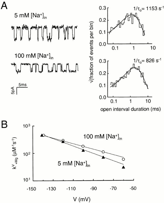 Figure 3. Effects of intracellular Na+ on the Mg2+ association rate constant. (A, left) Single-channel currents recorded with different intracellular Na+ concentrations. The extracellular solution contained 150 mM Na+ and 7 μM Mg2+, and the membrane potential was −80 mV. (A, right) Open interval duration histograms. Because intracellular Na+ slows the association of extracellular Mg2+, the inverse of open channel lifetime (τo) is faster in 5 mM [Na+]in (top histogram) than in 100 mM [Na+]in (bottom histogram). (B) The voltage dependence of the effect of intracellular Na+ on the Mg2+ association rate constant. The apparent Mg2+ association rate is plotted against the membrane potential for different [Na+]in. The solid lines are fits by . The inhibition of Mg2+ association by [Na+]in is enhanced by depolarization.